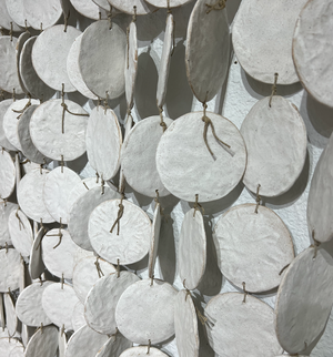 21 strands of white stoneware discs are knotted together with twine and assembled on hemp rope to create this masterpiece for any wall! Hangs on a 48" Walnut beveled wood bar. Does not include wall mounts.