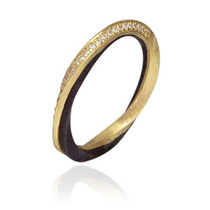 Designed and handmade in high carat 18k Yellow Gold and oxidized cobalt chrome. This twist of gold and oxidized cobalt chrome with diamonds flush set ontop the gold adds the perfect sparkle to this stunning day or night ring. The Eclipse band is a great addition to any ring collection.