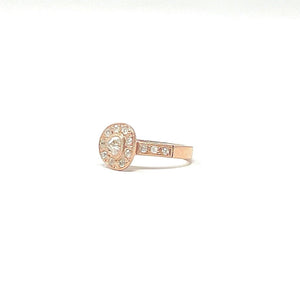 This one of a kind rose gold ring has a regal halo of diamond accents surrounds a shimmering center gem in this dazzling ring for a distinctive and elegant look.