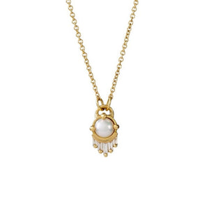 This sweet pearl and diamond necklace is a sparkling treasure that emerges from the sea; the necklace is made with a glowing white pearl and surrounded with a chevron of five needle baguette diamonds