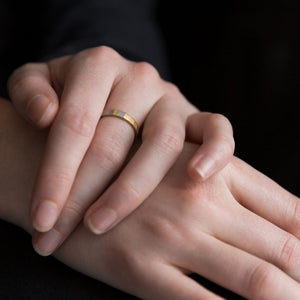 This timeless wide gold band, with facets of rain­bow gold, can be worn alone or mix with rain­bow faceted bands of vary­ing widths. This beauty is a perfect addition to any stacking ring collection.