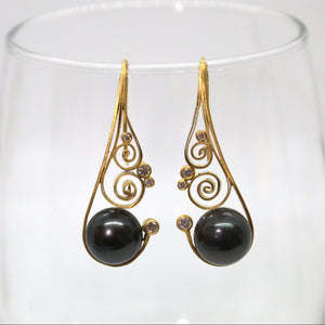 Hand-forged, hammered, and fabricated scroll motif curve over stunning black Tahitian pearls on these sculptural 18k gold drop earrings. Sleek arches frame simple scroll designs and a pair of glittering diamonds. 18k gold French hook ear wires.