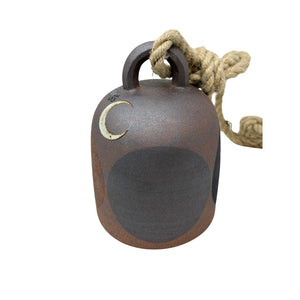 Round stoneware thrown bell with a carved loop is hand painted and assembled with a wood knocker and hemp rope.