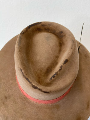 This  one of a kind, hand-crafted, sustainable hat is made out of 100% Nutria. This stellar hat is accessorized with a silk coral ribbon + a locally sourced pheasant feather in a bullet casing.