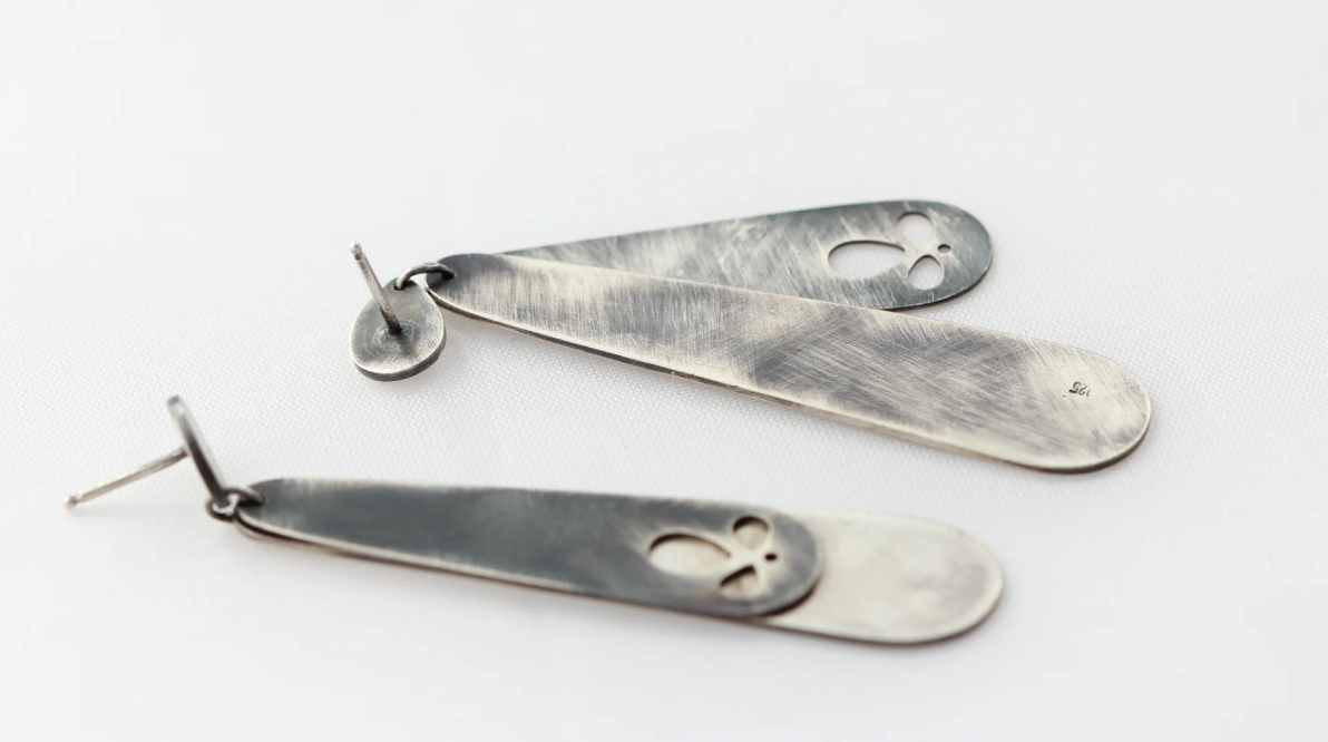 Double layered long earrings. oxidized and matte polished sterling silver. The top layer is oxidized with three little leaves cut out at the bottom of the top layer and the bottom layer is slightly polished.