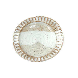Hand made dessert plates with a fluted rim are about 5.5 inches in diameter. Made from a locally sourced stoneware clay and a spotty cream white matte glazee. Dishwasher safe but hand washing is recommended.