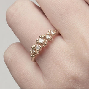 Unique diamond cluster engagement ring with golden granules, on a gently textured band.