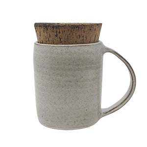 Handmade ceramic mug has a shiny light gray glaze. Comes with a cork topper for your to go drinks.