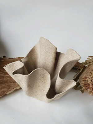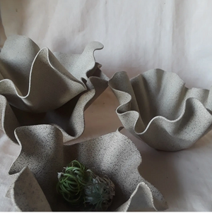 Unglazed cool-gray clay with tiny dark sparkles. About 7”. 3” base. Expect a lot of variation in their ultra organic shape, as these are made with spontaneity. Food safe; hand wash recommended.