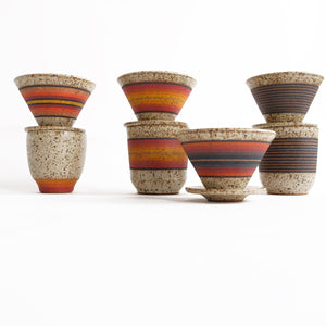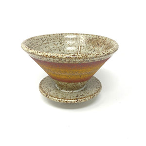 A classic Kat & Rodger dripper with a striped pattern. Ideal for your pour-over coffee routine. Each is made by hand and may vary slightly  due to the handmade processes. Measures approximately 3.5” tall and 5.5” wide.