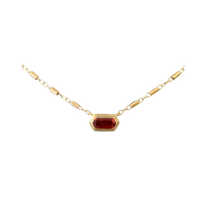 One of a Kind 14k yellow gold necklace with an elongated hexagon cut orange sapphire.