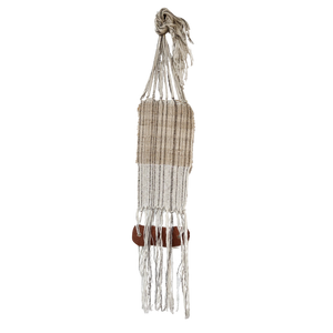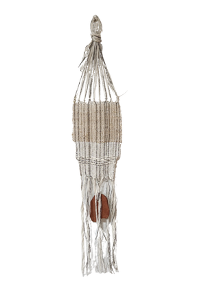 These beautiful pieces of wall art each have a unique handmade ceramic piece hanging from handwoven fibers + antique metallic thread. Each piece varies in size + color tones.