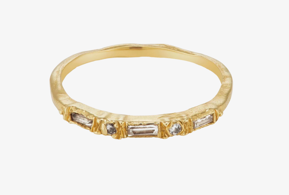 The softly distressed texture of the ring band contrasts with the colour of the diamonds. The diamonds are set into the texture of the ring, as though it has just been discovered, like buried treasure.