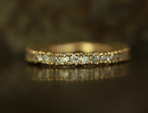 The X 2.5mm Old Cut Diamond Eternity Ring is inspired by the medieval jewellery hoards which have been found across Scotland. Diamonds flow into one another, organically set as though they have just been excavated.